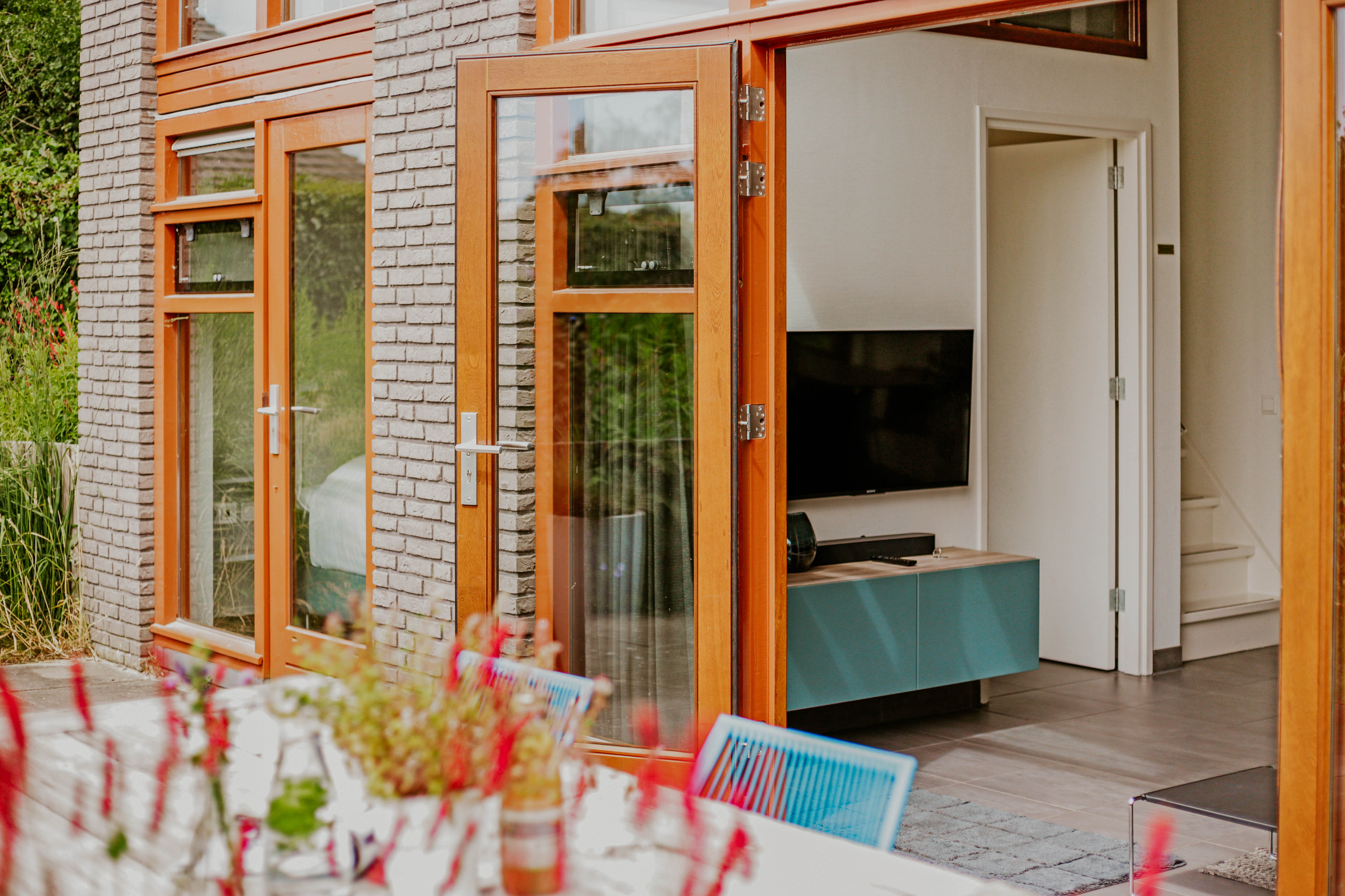 Die Unterkunft verfügt über ein gemütliches Wohnzimmer mit einem großen Ecksofa, einem Sessel und einem Flachbildfernseher mit Sonos-Soundsystem. Vom Wohnzimmer aus führen Flügeltüren auf die sonnige Terrasse mit Gartenmöbeln. Ideal für einen Snack und ein Getränk im geschützten Garten. Neben der Sitzecke befindet sich die moderne und offene Küche. Sie ist komplett ausgestattet und verfügt über einen Geschirrspüler, eine luxuriöse Nespresso-Maschine mit Milchaufschäumer, einen Wasserkocher, einen Gasherd und eine Kombimikrowelle.
