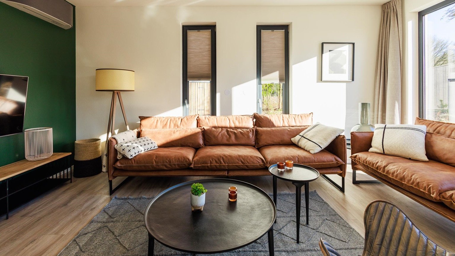Das geräumige Wohnzimmer ist hell mit großen Terrassentüren zur umliegenden Natur. Der Innenraum hat durch die Verwendung natürlicher Materialien und Farbtöne eine warme Atmosphäre. Es gibt eine gemütliche Sitzecke mit einem Flachbildfernseher und einem großen Esstisch. Die moderne Küche ist sehr komplett und unter anderem mit einem Induktionskochfeld, Geschirrspüler, Kombi-Mikrowelle, Nespresso-Maschine und Milchschäumer ausgestattet. Das Wohnzimmer ist klimatisiert.